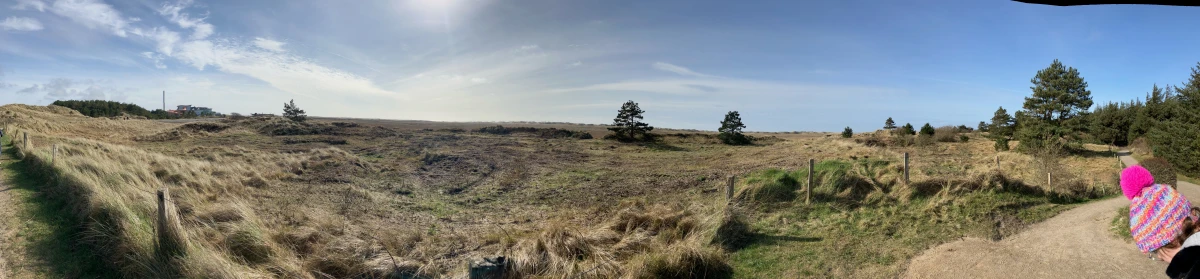 Unser Familienurlaub mit Kindern ist jeher geprägt von Ostseestränden … gelegentlich auch Nordsee. Diese Panoramaaufnahme ist meine Version des klassischen Postkartenformats und zeigt die Dünenlandschaft an der Nordsee, wenn ich mich richtig erinnere. Der kleine, farbige Fleck an der rechten unteren Seite deutet auf einen windigen und eher kühlen Tag im Herbst hin.