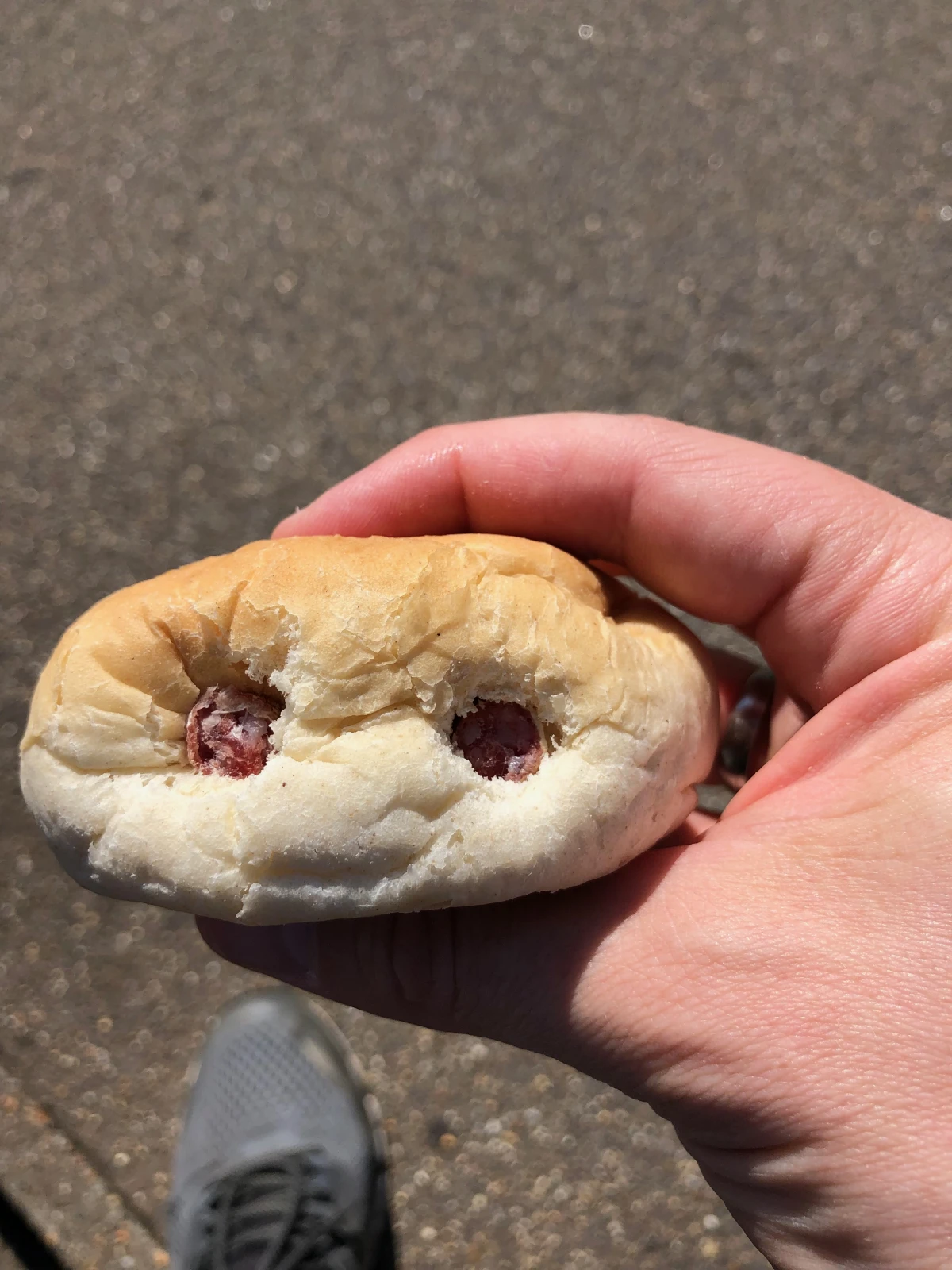 Auf Wanderungen kommen als Verpflegung meist Brötchen mit. Wer wie viel ist, ist vorab vornehmlich unklar, weswegen sie trocken eingepackt werden, sodass auch die Kinder sie essen können. Und die sind wählerisch, was den Aufschnitt angeht. Damit ich selbst nicht darauf verzichten muss, habe ich Salami-Sticks dabei, die ich in diesem Fall ins Brötchen gepresst habe. Herauskam diese Georg-Lucas-würdige Kreatur, die auf der Erde landet und nach Hause telefonieren möchte.