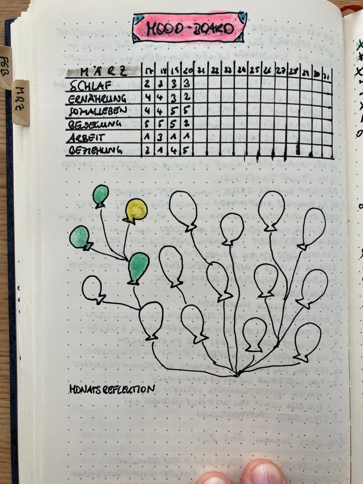 Diesen Ansatz verfolge ich in meinem Bullet-Journal. Ich habe dafür eine Collection angelegt, in der ich verschiedene Kategorien (Schlaf, Ernährung, Sozialleben, Bewegung, Arbeit und Beziehung) auf einer Skala von 1 bis 5 bewerte. Zusätzlich gibt es für jeden Tag einen Ballon, den ich je nach Stimmung am Abend grün, gelb oder rot einfärbe. Ich bin gespannt, welche Erkenntnisse sich daraus ergeben – hier ein Bild nach vier Tagen: